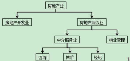 房地产业主要包括房地产开发经营、房地产中介服务、物业管理和其他房地产活动。其中,房地产中介服务和物业管理合称房地产服务业;房地产中介服务又分为房地产咨询、房地产估价和房地产经纪。因此,房地产业可分为房地产开发经营业和房地产服务业,房地产服务业又可分为房地产中介服务业和物业管理业,房地产中介服务业又可分为房地产咨询业、房地产估价业和房地产经纪业。