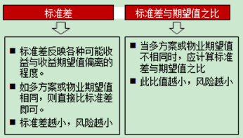 第四步,如两物业期望值不同,需计算标准差与期望值之比,该比值小的那个风险小。