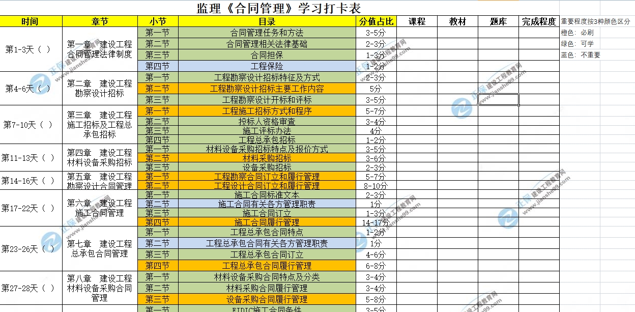 学习打卡表标注了必刷、可学及不重要,考生可根据学习打卡表的内容规划自己的学习时间及学习内容。