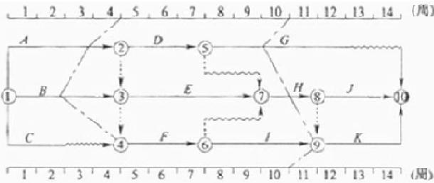 某工程双代号时标网络计划执行到第4周末和第10周末时,检查其实际进度如下图前锋线所示,检查结果中正确的有( )。