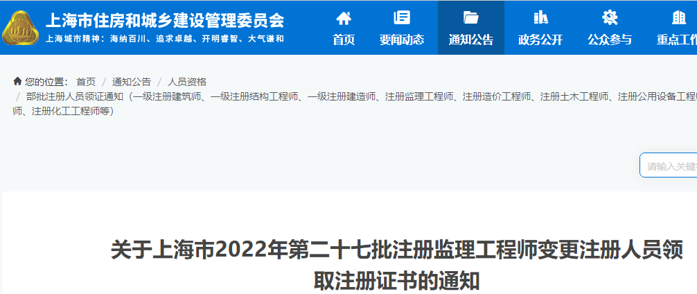 上海2022年第二十七批注册监理工程师变更注册人员领取注册证书的通知