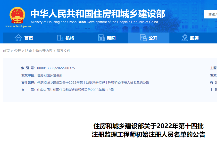 住建部关于2022年第二批注册监理工程师初始注册人员名单的公告