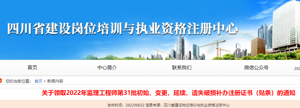 关于领取2022四川监理第4批初始、变更、遗失破损补办注册证书的通知