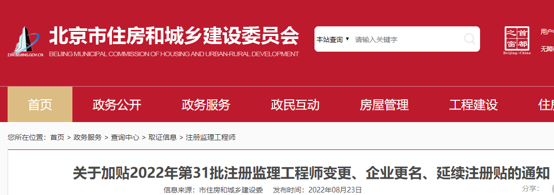 北京加贴22年第31批注册监理工程师变更、企业更名、延续注册贴的通知
