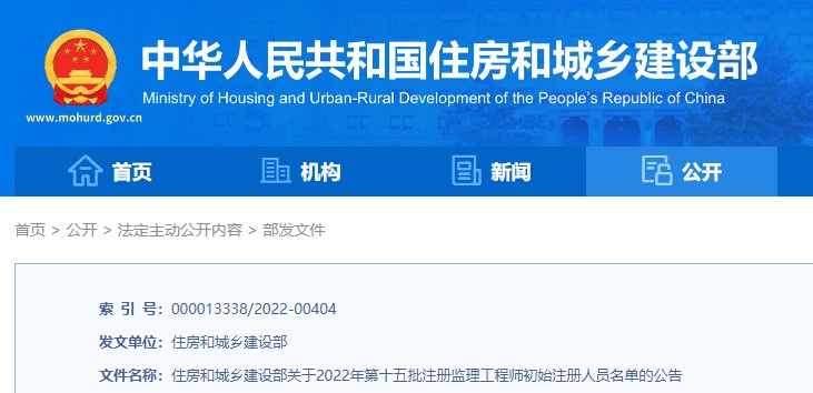 住建部关于2022年第十五批注册监理工程师初始注册人员名单的公告