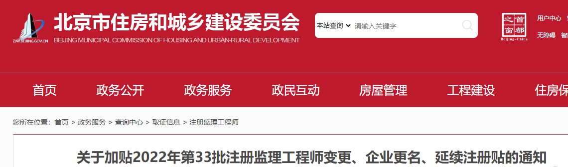 北京市关于加贴2022年第33批注册监理工程师变更、延续注册贴的通知