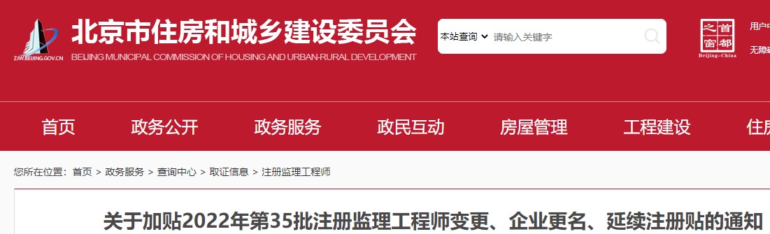 北京关于加贴2022年第35批注册监理工程师变更、延续注册贴的通知