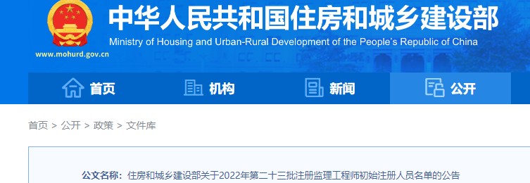 住建部关于2022年第二十三批注册监理工程师初始注册人员名单的公告