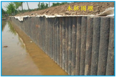 3.木桩竹条土围堰:利用木桩(松木使用较多)及打入水中形成排式挡水结构,一侧填土来进行过止水。