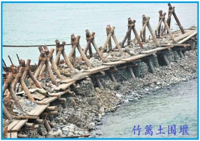 4.竹篱土围堰:采用木桩打入水中形成框架,利用竹篱填土石来而形成的挡水结构。