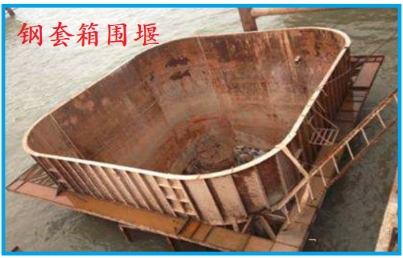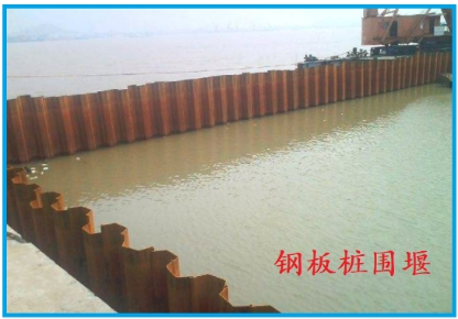 7.钢板桩围堰:利用钢板桩打入到水中形成的挡水结构,钢板桩是带有锁口的一种型钢,其截面有直板形、槽形及Z形等,有各种大小尺寸及联锁形式。