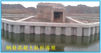 8.钢筋混凝土板桩围堰:利用钢筋混凝土板桩打入到水中土体形成的挡水结构,钢筋混凝土板桩不仅仅是单独的板桩式构件,而是指由钢筋混凝土板桩构件沉桩后形成的组合桩体,是一种易工厂化,装配化的围护结构。