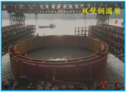 10.双壁钢围堰:双壁钢围堰为圆形围堰,其堰壁钢壳是由有加劲肋的内外壁板和若干层水平桁架所组成,水平桁架的间距根据围堰灌水下沉和围堰内抽水各阶段的水头压力计算,为1.0~1.4m不等。堰壁底端设刃脚,以利于下沉入土。在堰壁内腔,用隔舱板等分为若干个密封的隔舱,借助向密闭隔舱注水或抽水来控制双壁钢围堰在下沉时的倾斜。
