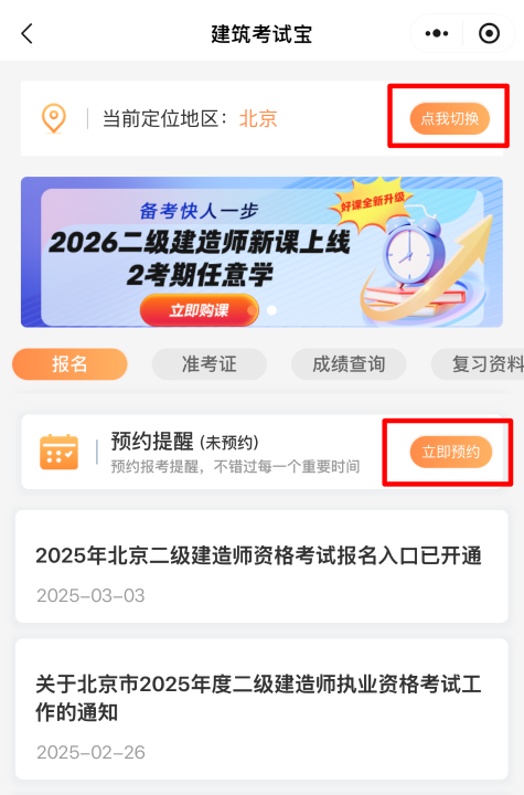 参加2026年二级建造师的考生注意咯,二建考试报名工作一般集中在考试当年2至4月进行,如果大家担心忘记,就来订阅我们的报名预约提醒吧,方式如下,希望大家这一年报考顺利!