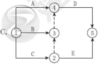 某工程有A.B.C.D.E五项工作,其逻辑关系为A.B.C完成后D开始,C完成后E才能开始。则据此绘制的双代号网络图是( )。
