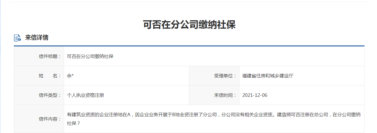 福建省回复建造师可否在分公司缴纳社保问题