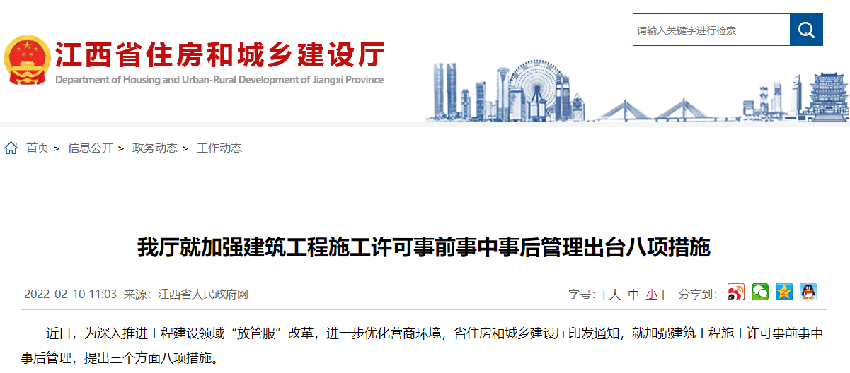 江西加强建筑工程施工许可事前事中事后管理出台八项措施