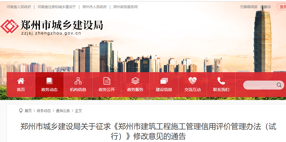 关于征求《郑州市建筑工程施工管理信用评价管理办法(试行)》修改意见的通告