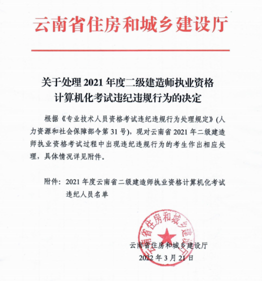 云南关于处理2021年度二级建造师考试违纪违规行为的决定