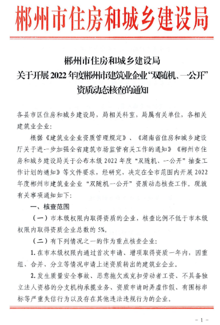 关于开展2022年郴州市建筑业企业“双随机一公开”资质动态核查的通知