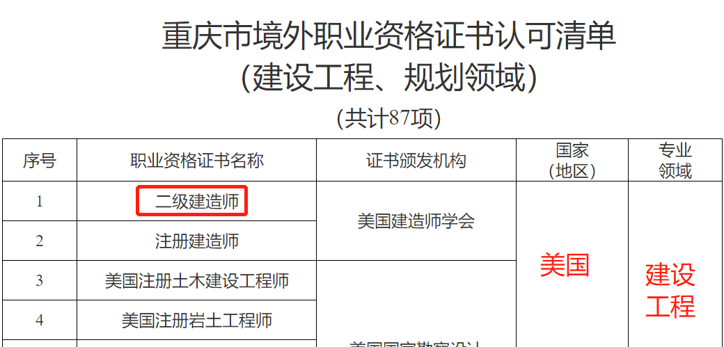 重庆关于印发《重庆市境外职业资格证书认可清单(建设工程、规划领域)》的通知