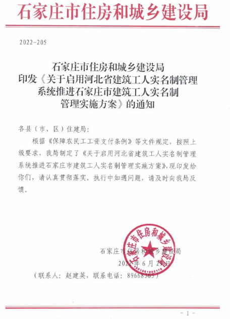 印发庄石家庄市建筑工人实名制管理实施方案的通知