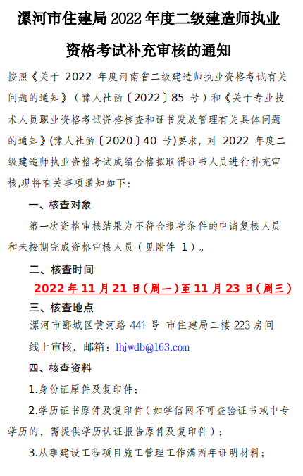 许昌市住建局关于开展2022年度二级建造师执业资格考试补充审核的通知