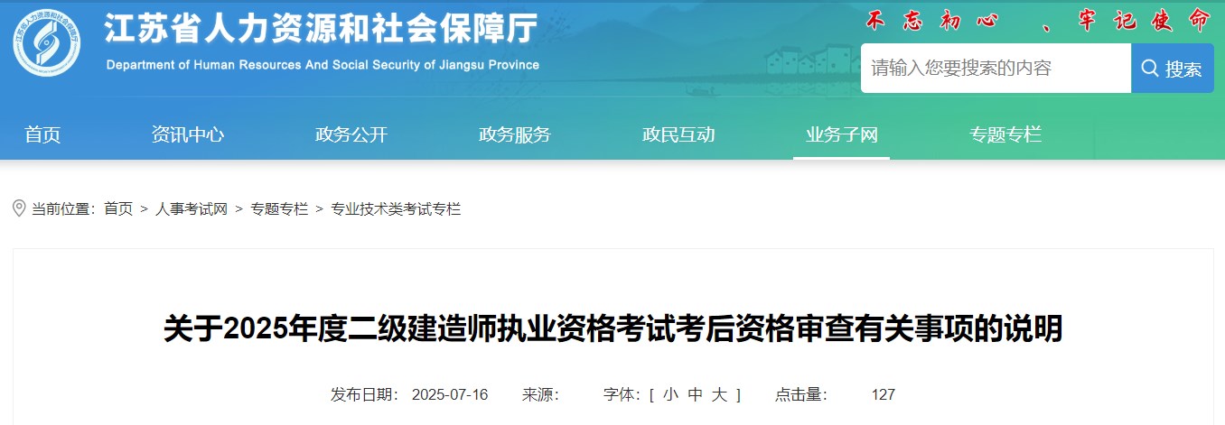 江苏关于2025年度二级建造师执业资格考试考后资格审查有关事项的说明