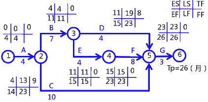 某住宅工程,砖混结构,地上7层。项目经理决定将整个施工任务划分成7个工作(A、B、C、D、E、F、G)。用两个圆圈和一个箭号图形表示一项工作,根据工作之间的逻辑关系,将工作连接起来,编制了施工进度计划双代号网络图如下(单位:月)