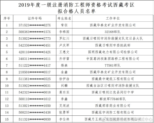 根据《司法部关于印发开展证明事项告知承诺制试点工作方案的通知》(司发通〔2019〕54号)、《人力资源社会保障部办公厅关于印发<人力资源社会保障系统开展证明事项告知承诺制试点工作实施方案>的通知》(人社厅发〔2019〕71号)及《人力资源社会保障部人事考试中心关于印发<专业技术人员资格考试报名证明事项告知承诺制试点工作实施方案>的通知》(人考中心函〔2019〕26号)的规定和要求,现将2019年度一级注册消防工程师成绩合格、拟取得资格证书人员予以公示。(名单附后)