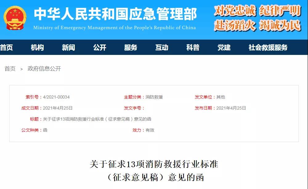 应急管理部:关于征求13项消防救援行业标准(征求意见稿)意见的函