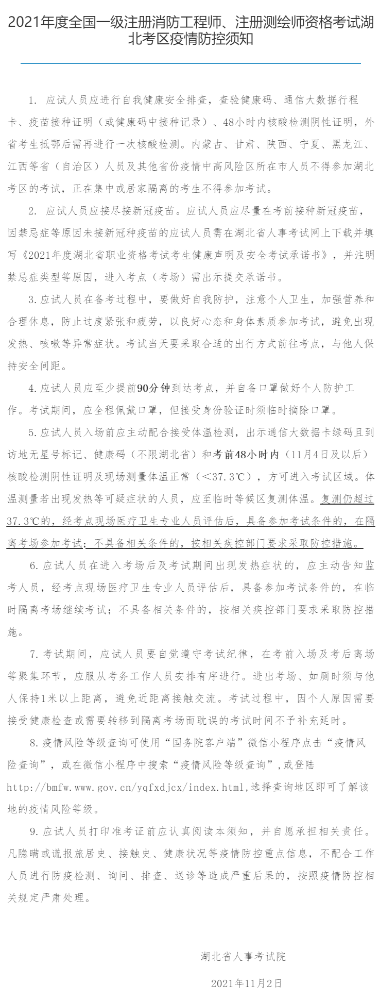 2021年度全国一级注册消防工程师专业资格考试湖北考区疫情防控须知