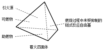 研究表明,可燃物的多数氧化反应不是直接进行的,而是通过自由基团和原子这些中间产物瞬间进行的循环链式反应。当可燃物受热时,不仅会发生气化,而且可燃物的分子会裂解为简单分子,这些分子中原子间的共价键发生断裂,生成自由基,从而使燃烧得以持续。链式反应过程经过链引发、链传递和链终止三个阶段。可见,自由基的链式反应是燃烧反应的实质,光和热是燃烧过程中的物理现象。对于多数有焰燃烧而言,其燃烧过程中存在未受抑制的自由基作为中间体。因此,可以用着火四面体(如图1-1-2所示)来表示有焰燃烧的四个条件, 即可燃物、助燃物、引火源和链式反应自由基,分别对应图1-1-2中四面体的四个面。