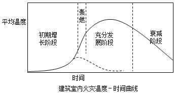 对于建筑火灾而言,最初发生在室内的某个房间或某个部位,然后由此蔓延到相邻的房间或区域,以及整个楼层,最后蔓延到整个建筑物。其发展过程大致可分为初期增长阶段、充分发展阶段和衰减阶段。下图为建筑室内火灾温度-时间曲线。