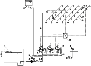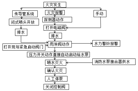 准工作状态时,由稳压设施维持雨淋阀入口前管道内充水的压力。火灾时,由火灾自动报警系统或传动管自动控制开启雨淋报警阀和供水泵,向系统管网供水,由雨淋阀控制的开式喷头同时喷水。