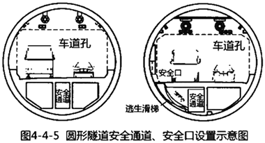 圆形隧道的安全通道常设置在车道板下,通过安全口和爬梯、滑梯进出。人员可从安全口,经安全通道进行长距离疏散。