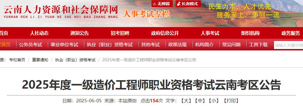 云南考区2025年度一级造价工程师职业资格考试报名通知发布