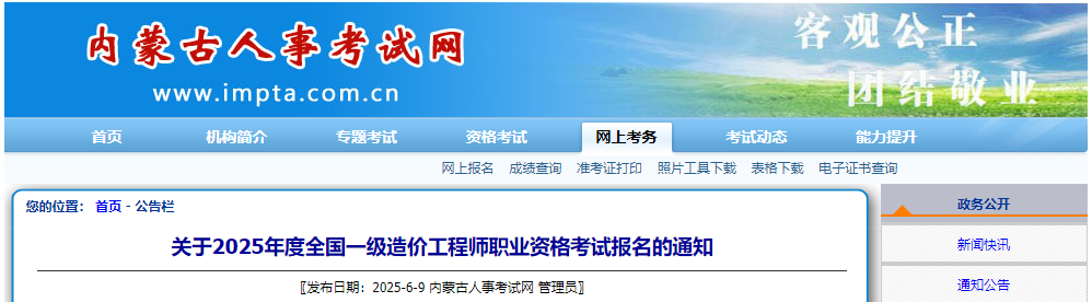2025年度内蒙古考区一级造价工程师职业资格考试报名通知