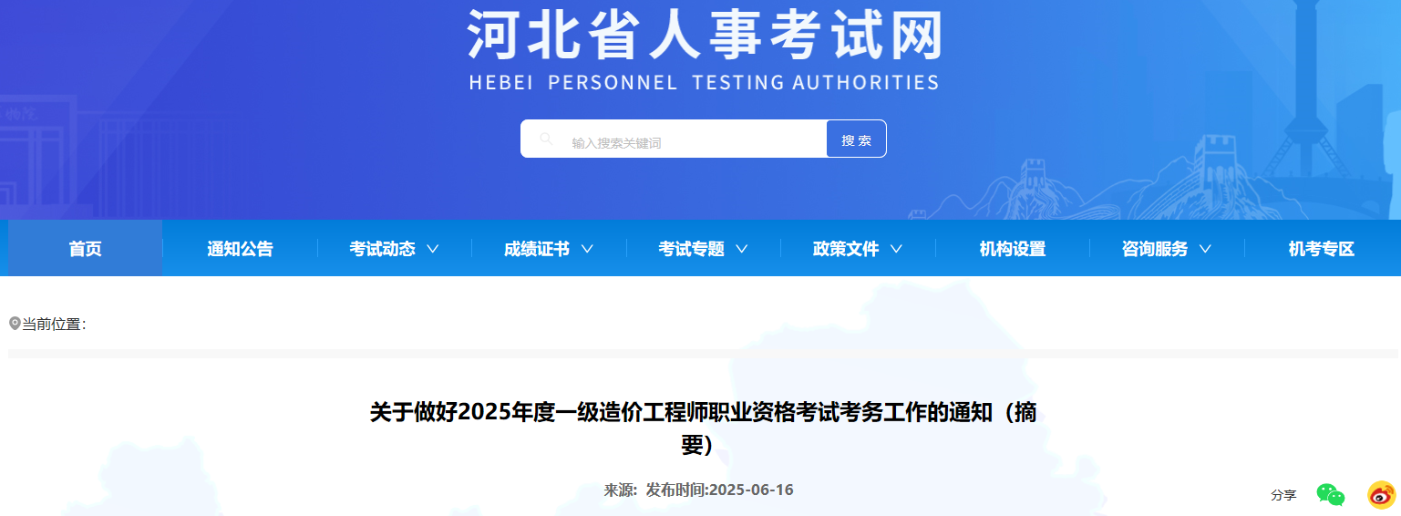 河北省2025年度一级造价工程师职业资格考试报名通知