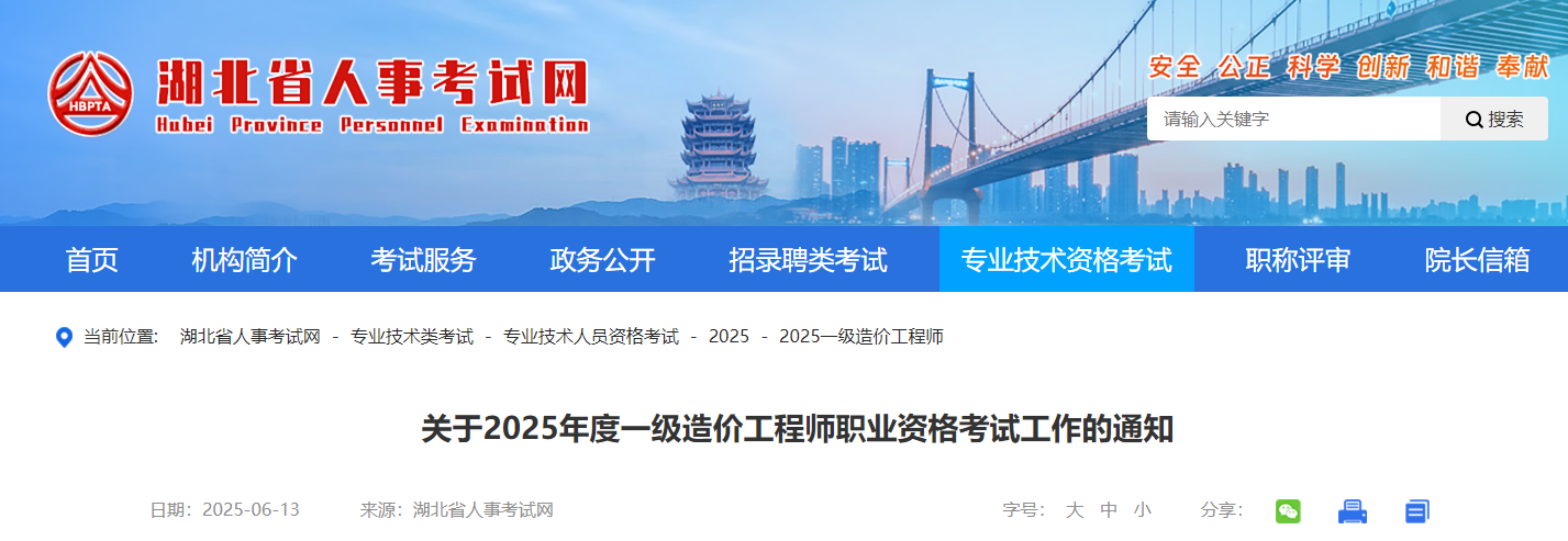湖北考区2025年度一级造价工程师职业资格考试报考通知