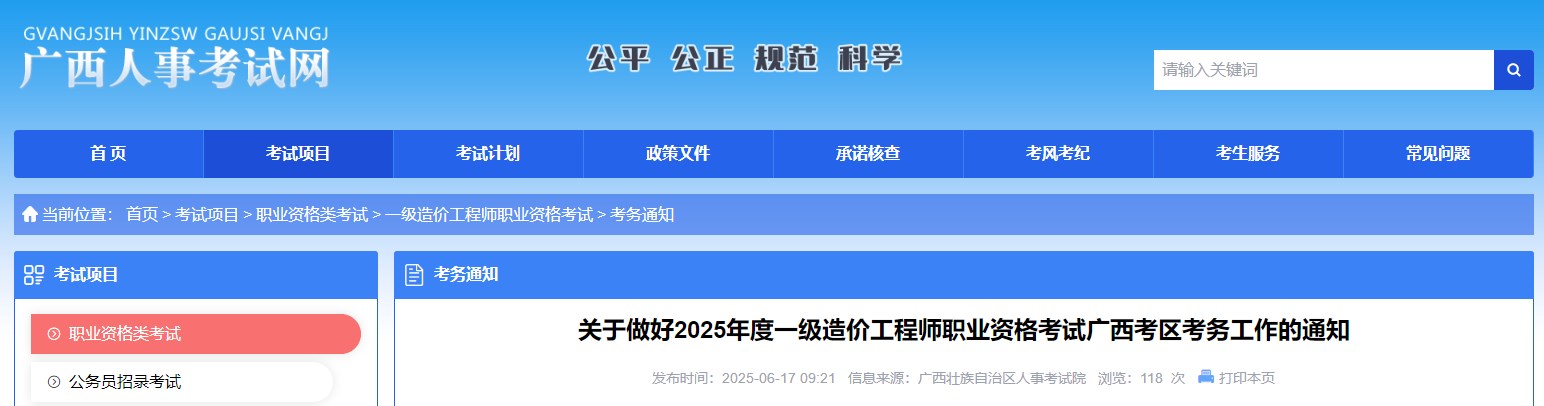 广西省2025年度一级造价工程师职业资格考试报名通知