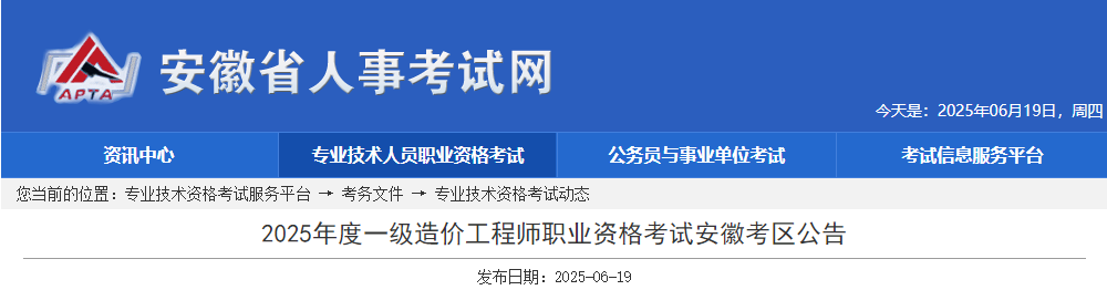 安徽考区2025年度一级造价工程师职业资格考试报名公告