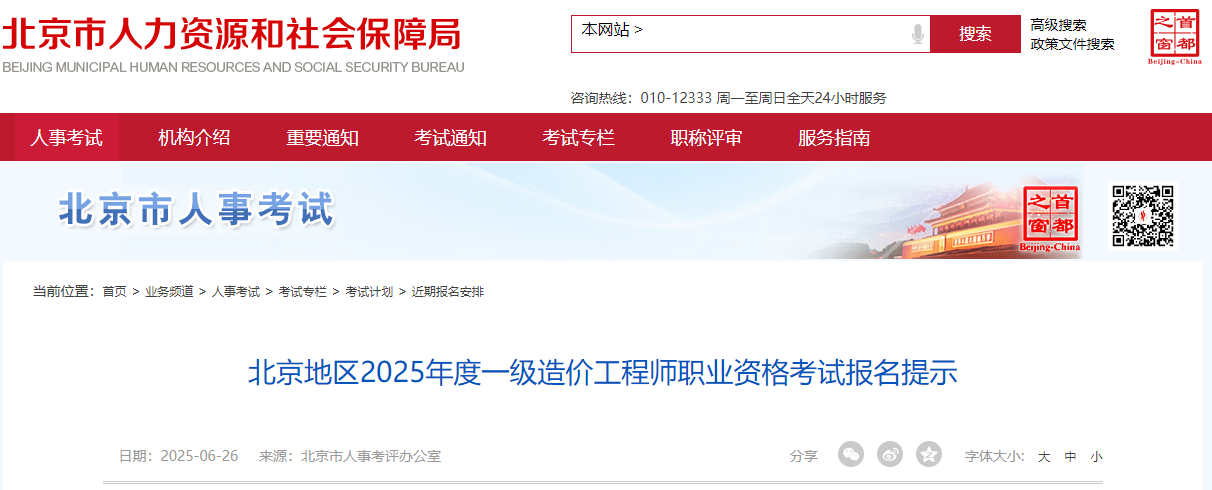 北京地区2025年度一级造价工程师职业资格考试报名提示