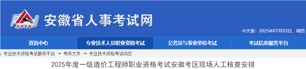 安徽考区2025年度一级造价工程师职业资格考试现场人工核查安排