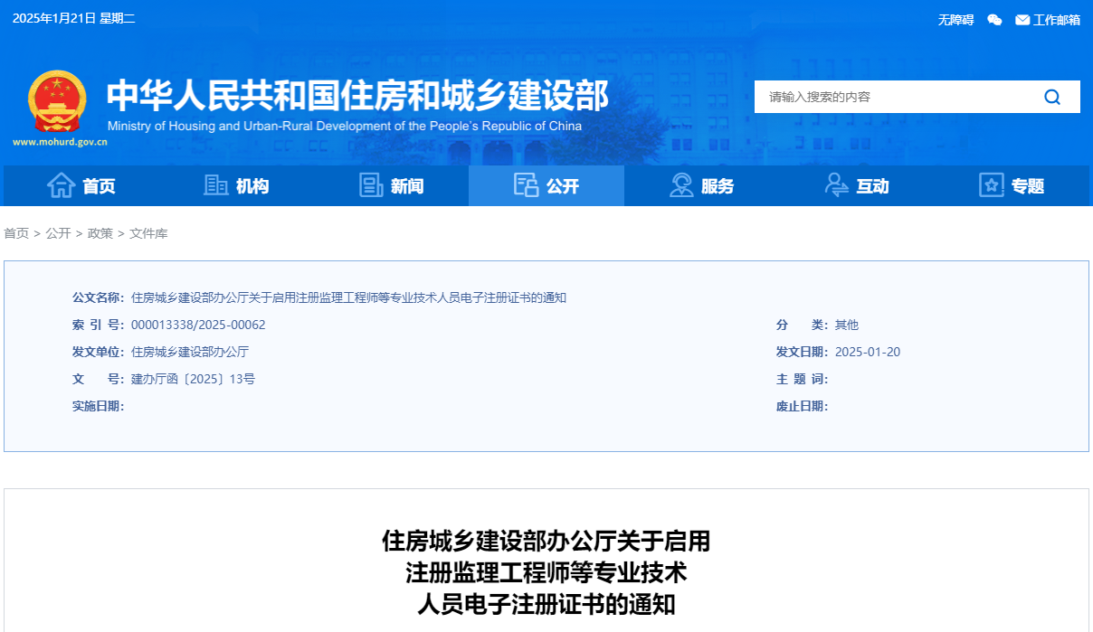 住房城乡建设部启用注册一级造价工程师等专业技术人员电子注册证书