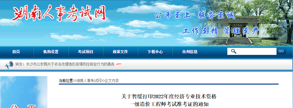 湖南暂缓打印2022年一级造价工程师考试准考证通知