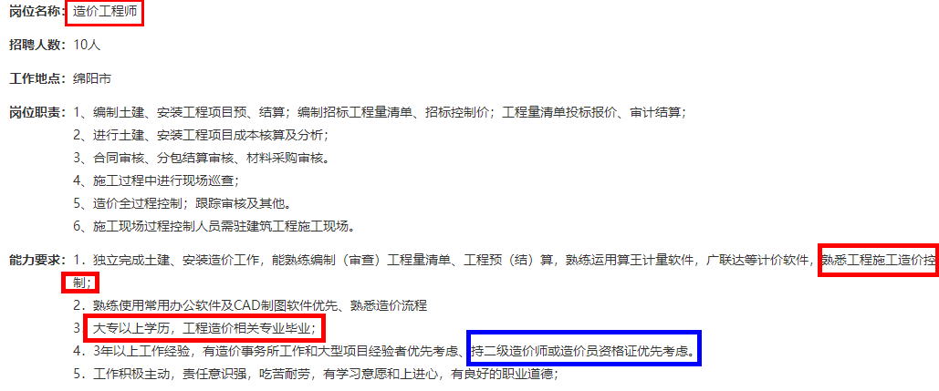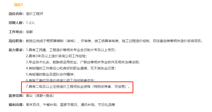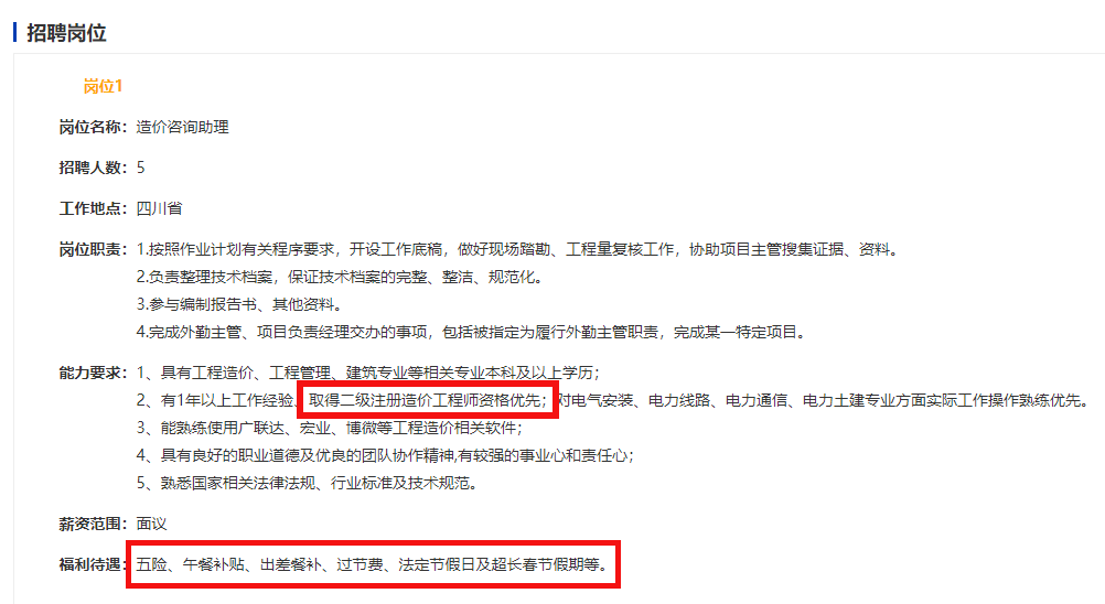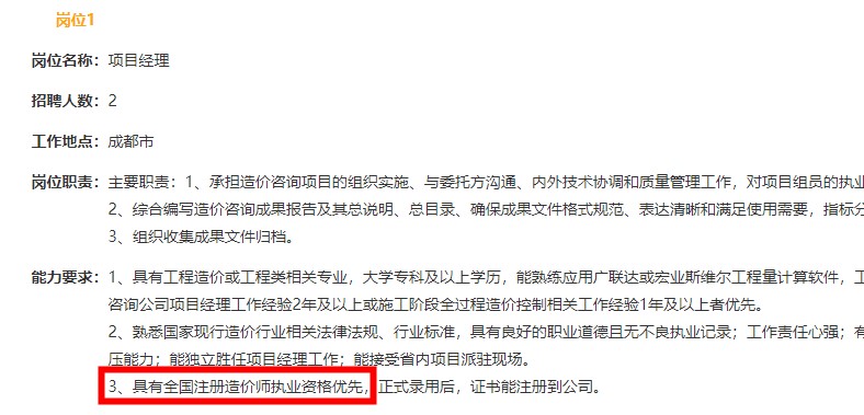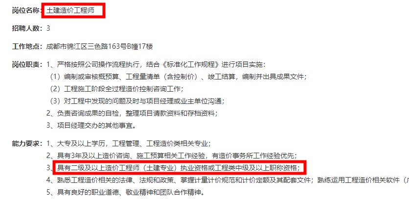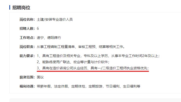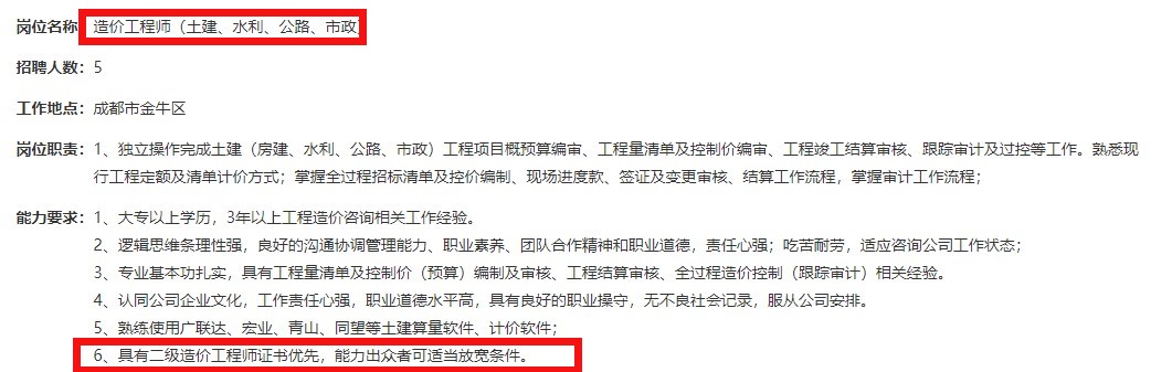 四川某公司招聘造价咨询助理,取得二级注册造价工程师资格优先