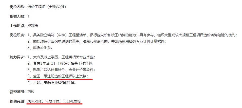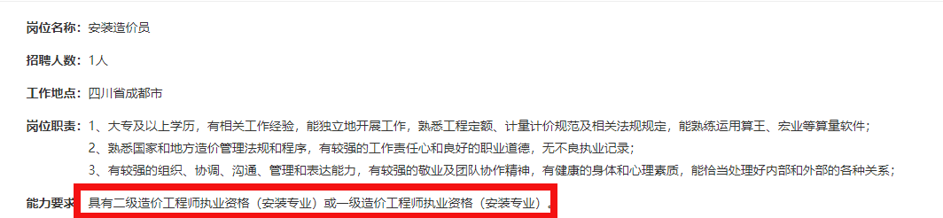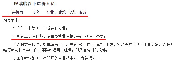 又有公司招聘造价工程师,有二级造价证书就可以应聘!