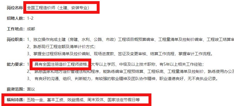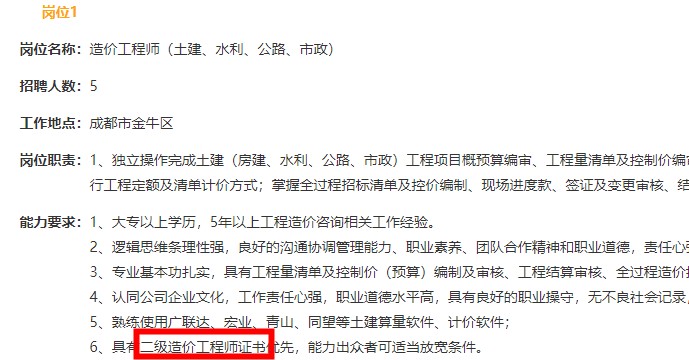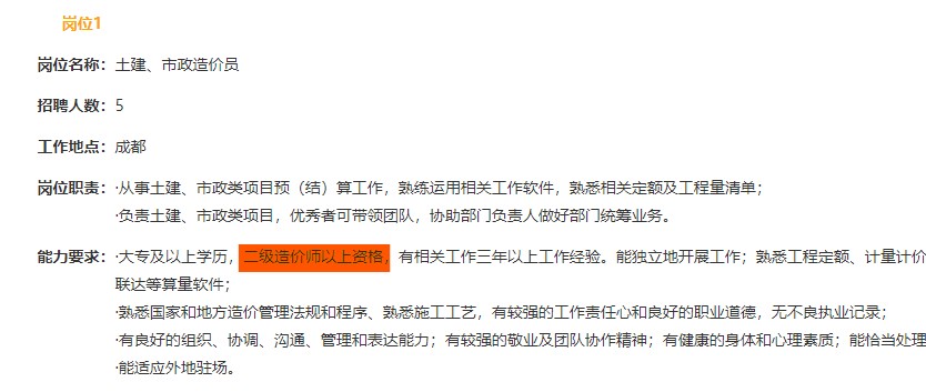 某大型建筑公司招聘多个岗位,要求持有二级造价工程师证!