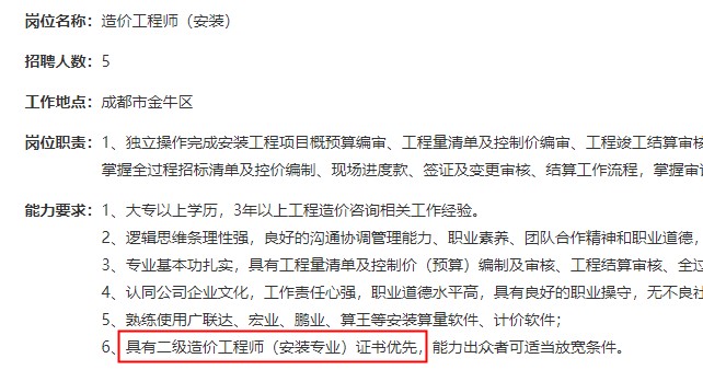 某公司招聘安装造价员,具有二级造价工程师执业资格优先!